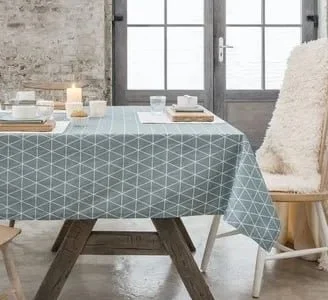 Table à manger avec une nappe à motif géométrique, assiettes, verres, bougie, dans une pièce avec mur en pierre et fenêtre.